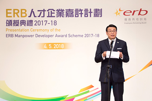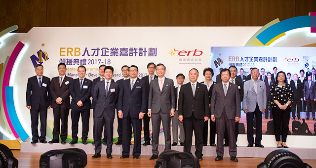 「 ERB人才企業嘉許計劃 」頒授典禮2017-18於2018年5月4日圓滿舉行。行政會議成員林正財醫生, BBS, JP、ERB主席梁永祥博士, SBS, JP、副主席余鵬春先生, SBS, JP、勞工及福利局局長政治助理馮興禮先生,以及ERB行政總監吳國强先生, BBS主禮,約400名政府、僱主、商會、培訓機構代表出席頒授典禮,共同見證「人才企業」的卓越成就。