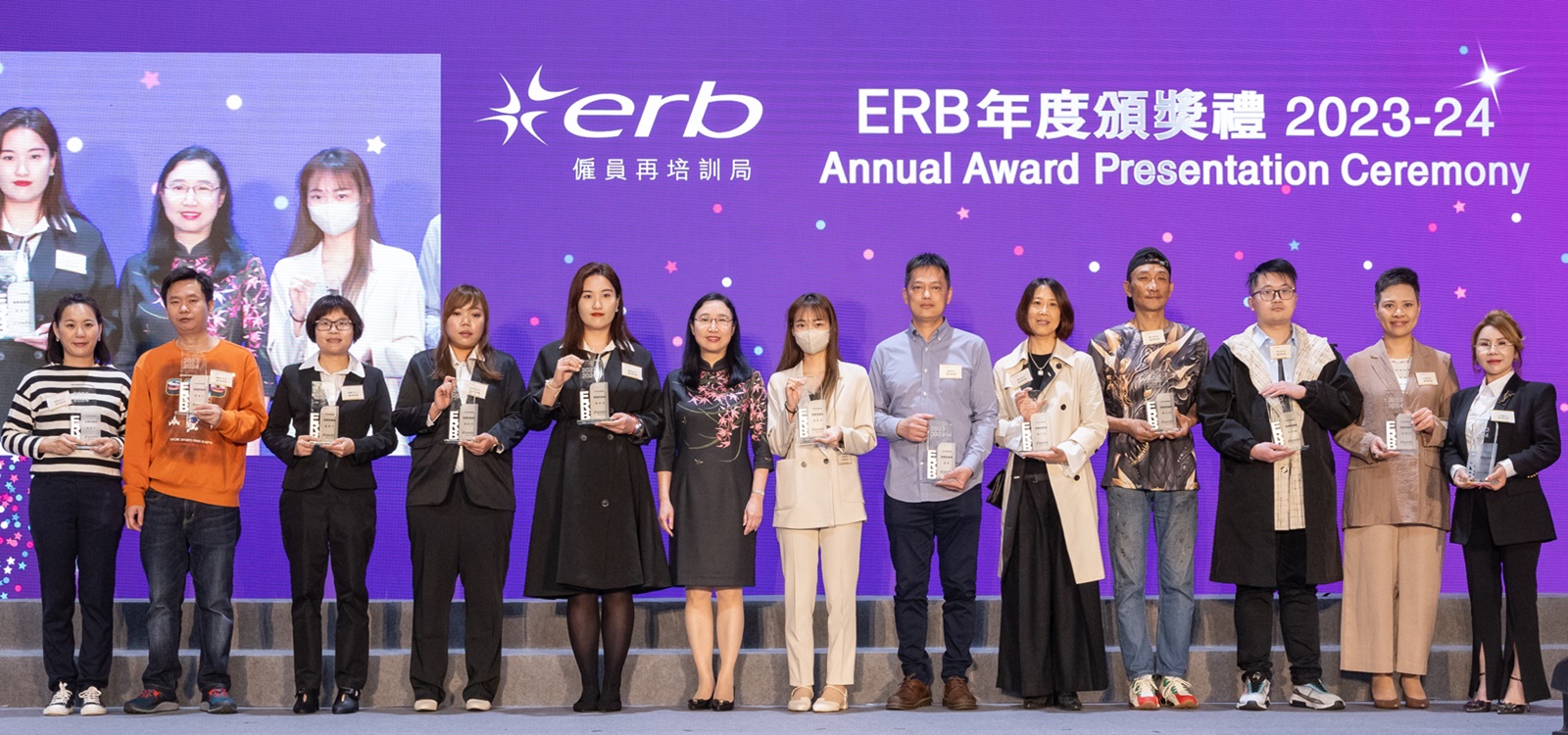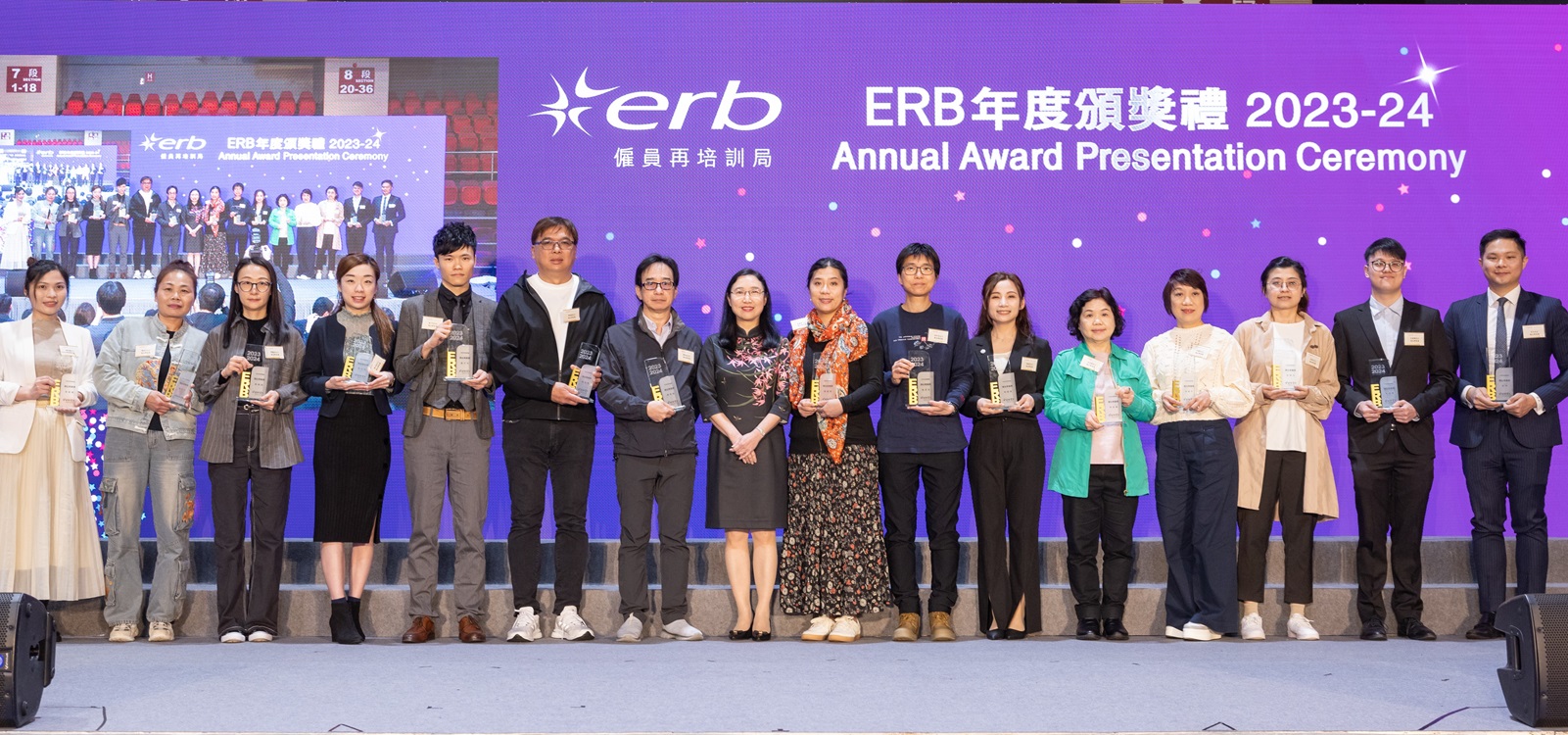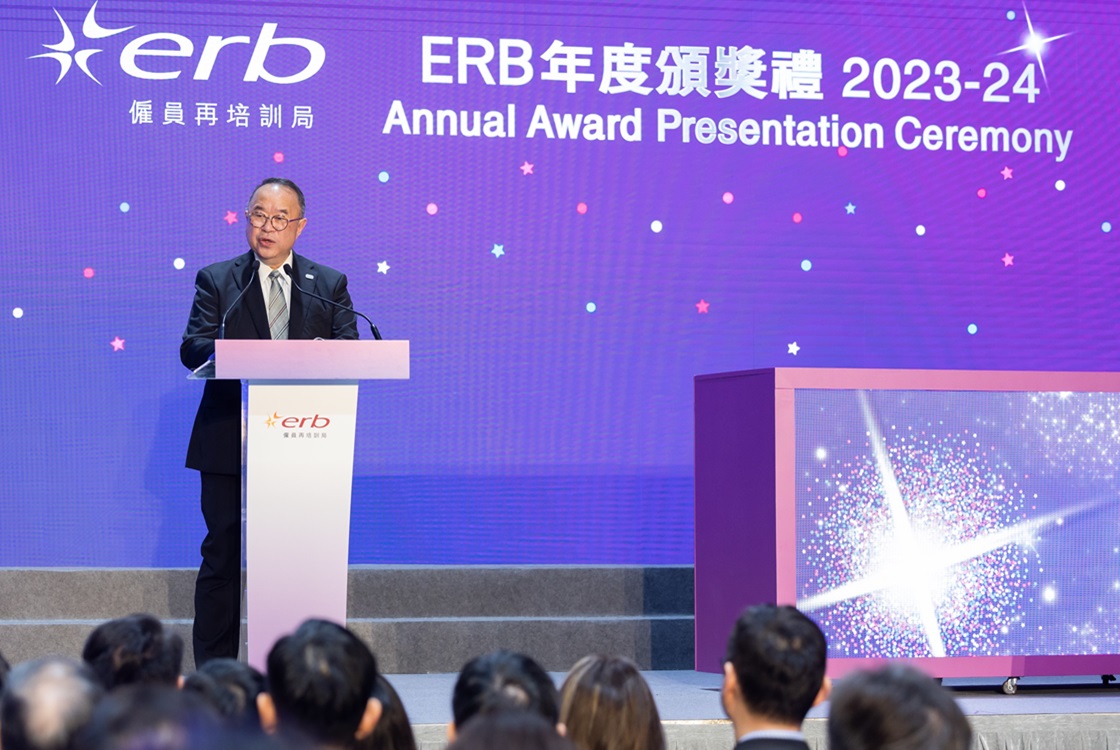 僱員再培訓局(再培訓局)今天(2024年3月19日)在旺角麥花臣場館舉行「ERB年度頒獎禮2023-24」,由勞工及福利局常任秘書長劉焱女士, JP、副局長何啟明先生, JP、勞工處處長陳穎韶女士, JP,聯同再培訓局主席余鵬春先生, GBS, JP、副主席黃傑龍教授, BBS,JP及行政總監吳國强先生, BBS共同主禮,頒發逾百個獎項,表揚學員奮發自強,積極參與技能培訓,提升就業競爭力,以及各界伙伴協力推動再培訓工作,為各行各業培育人才。